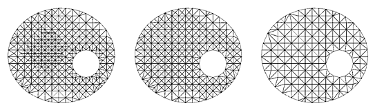 1. Предложен, исследован и применен в нескольких задачах фрактальный алгоритм построения последовательности неравномерных вложенных двумерных триангуляций по известной характеристической функции двумерной области. В основе рассматриваемого метода триангуляции лежит единственность представления прямоугольного равнобедренного треугольника в виде объединения двух подобных треугольников (рис. VI.2). На базе этого метода триангуляции разработан алгоритм построения последовательности неравномерных вложенных сеток по известной характеристической функции двумерной области и в соответствии с заданной на области функцией локального размера триангуляции (рис. VI.3).